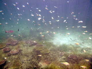 Nous avons ensuite déjeuné sur une belle plage au nord de Tioman (Salang village). Puis arrêt sur l'îlot en face. Je suis descendue sans palmes et à un moment j'ai vu que j'étais entraînée par un courant assez fort, impossible de faire demi tour pour rejoindre le bateau assez loin. Au mieux je faisais au sur-place ! J'ai appelé Chloé qui n'était pas très loin avec Evan (et elle avait ses palmes) pour lui dire de ne pas venir jusqu'à la zone de courant et de faire signe au bateau de venir me chercher. Un autre bateau avec quelques touristes ne se mettant pas à l'eau est venu me chercher et m'a ramené à mon bateau. Je n'étais pas en détresse parce que le courant m’entraînait au pire vers la plage que nous venions de quitter, mais faire du sur-place est fatiguant (et un peu rageant) ! En plus, quand je l'ai appelée, Chloé aidait Evan qui n'avait pas non plus mis ses palmes et qui n'arrivait pas à nettoyer son masque et ses yeux...